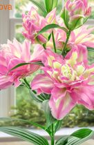 Soft Music в переводн МЯГКАЯ МУЗЫКА Роскошные цветы восточной лилии Софт Мьюзик необычайно красивы, что так и напрашиваются в свадебный букет невесты. Благодаря восхитительной форме лепестков и чудесному аромату этому сорт нет равных и на клумбе и в вазе на столе!Расцветает эта ароматная красавица лилия Софт Мьюзик в начале июля образуя на прочном стебле крупные цветы нежно-розового оттенка с молочно-желтой прожилкой вдоль махровых лепестков. Захватывает дыхание от вида распустившегося цветка диаметром 15-20 см. А продолжительность цветения будет радовать долгое время, не успеете налюбоваться одим бутоном, как следом распускается другой цветок маня Вас своим ароматом.Высота очаровательной лилии Soft Music достигает 100-120 см, листья глянцевые темно-зеленого оттенка густо расположены вдоль стебля. В срезке сорт устойчив, чему порадуется любая хозяйка, а для предпринимателей это настоящая находка.