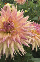 h-110см, Ø-12-17см Переливы драгоценной броши -так смотриться Cabana Banana. Прикрепить такое украшение к своему наряду вряд ли получится, а вот понаблюдать за ним – очень даже. Тем более что георгин Кабана Банана обожает внимание и любит выставлять напоказ свои огромные соцветия, состоящие из лепестков-трубочек с сильно изрезанными краями. Он хвастается необычной расцветкой раскрывшихся бутонов, достигающих 17-ти сантиметров в окружности. В их основании прослеживается теплый желтый оттенок, который плавно переходит в нежный розовый, а заканчивается и вовсе сиреневым. Эффект от подобных цветовых переливов зависит от степени солнечного освещения. Днем георгин буквально светится изнутри, вечером кажется таинственным и скромным.