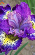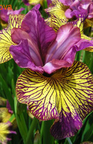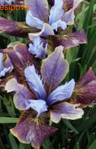 Ирис сибирский Мультикорол Интерест ., роскошный, словно золотом расписанный цветок, чудо селекции! В соцветии фолсы сливово-темно-фиолетовые, с желтым пятном и фиолетовыми прожилками, стандарты сиреневые с фиолетовыми прожилками Высота 40-50 см