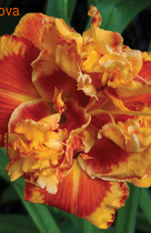 PAPRIKA FLAME Цветки махровые, до 14 см в диаметре, огненные,оранжево-красные с более темным глазом и золотистым горлом. Края лепестков бахромчатые. Высота взрослого растения: 60-70 см Период цветения: Июль-август