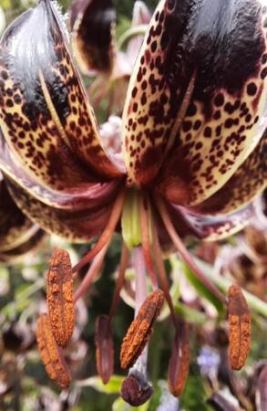 Цветы темно-бордовые,роскошный леопардовый крап Размер цветка 7 см. Высота - 180 см.Цветет в июне. Сажать лучше в слегка притененном месте.Почва плодородная, слегка щелочная. На стебле может быть до 30 цветков.