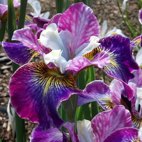 фолсы насыщенно-фиолетового цвета со слегка более светлыми краями, у основания желтое пятно с фиолетовой сеточкой, стандарты ярко-лиловые с небольшими светлыми пятнышками и штрихами, верх голубые с розовыми переливами