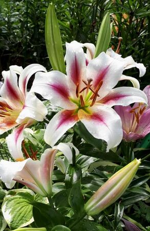Расцветает лилия Nymph в июле, образуя роскошные крупные цветы кремового оттенка с ярко-малиновой полоской вдоль лепестка. Цветок лилии Нимфа словно корона величественно направленная вверх, огромного размера бутоны раскрываются в ароматные цветы диаметром до 25 см. Ещё одна изюминка этого сорта, лилия Нимфа способна генерировать до 40 бутонов на одном прочном высоком стебле. Высота лилии Nymph 120-140 см. Цветы этой красавицы великолепно смотрятся в срезке и очень устойчивы.