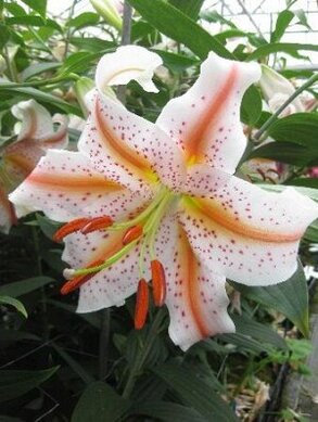 ЛИЛИЯ-ЛЕОПАРД.Сорт необычайно красивой окраски. Цветки белые, с ярко розово-малиново-красными полосами и ярко розовым крапом. , центр зеленовато-желтый. Края волнистые, диаметр цветка 19-21 см. Высота 110 см. Запах нежный, приятный. Цветет продолжительное время начиная с конца июля. В соцветии 5-8 бутонов. Лилия универсального применения.