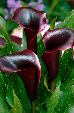 Очень эффектная и красивая садовая калла Schwarzwalder станет лидером среди цветов благодаря своей броской окраске. Калла Шварцвальдер пользуется большим спросом и положительными отзывами среди цветоводов, не требует ухода, что кстати для начинающего садовода. Период цветения каллы Schwarzwalder приходится на июль-сентябрь, распускаясь роскошными воронковидными цветами черного цвета с мягким переходом в темно-бордовый оттенок. Высота цветка 6-8 см, а диаметр до 10 см. Продолжительность цветения каждого цветоноса 2-4 недели.