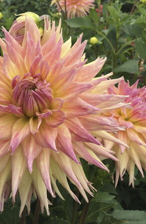 Истинный осенний джентльмен! Георгина Пенхилл Отэм Шейдс – обладатель самой что ни на есть «осенней» расцветки. Только не блеклой и унылой, а жизнерадостной и позитивной, доказывающей, что осень может быть красивой, теплой и вдохновляющей. В огромных пушистых бутонах сочетаются нежнейшие оттенки розового и персикового. Но не думайте, что они расположены в хаотичном порядке! Краски последовательно сменяют друг друга: желтый центр цветка плавно перетекает в кремовые лепестки с розоватым напылением по краю. Здесь вам и оттенок первых желтых листьев, и теплого осеннего вечера, и зябкого утра, наполненного туманом. А теперь самое интересное: георгина Пенхилл Отэм Шейдс начинает цвести посреди лета, давая возможность привыкнуть в теплым осенним краскам.