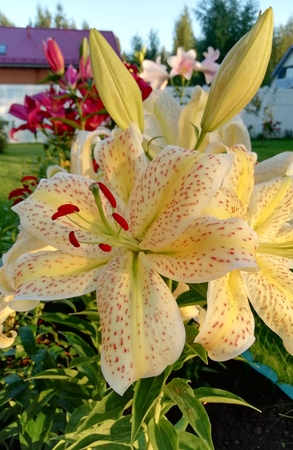 Цветки кремовые с желтыми продольными полосами по центру лепестков и c темно-красным частым крапом по всей поверхности лепестков. Высота 130 см. Цветки 20 см в диаметре. Насыщенный сильный аромат. Цветет в июле.