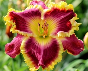SUNSET STRIP Селекционер:Pierce-G Год селекции:2012 Большой изумительный интенсивно-вишнёво-красный с огромным очень гофрированным золотым краем