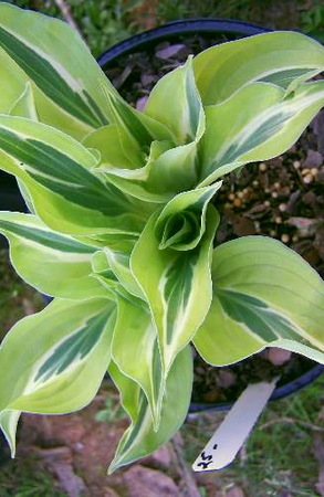 Оригинатор Leonard Jones, 2005 спорт от сорта 'Stripteasе листья ланцетные, некрупные, со слегка волнистым краем. Цвет меняется в течение сезона: вначале темно-зеленый со светло-желтым краем, край и середину разделяет довольно широкая белая полоса (фото сверху - весенняя окраска). Позже центр остается темно-зеленым, край становится яблочно-зеленым, белая полоса разделяющая край и центр остается.размеры средняя хоста (М). Размер куста примерно 30х30 см