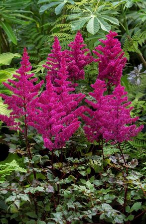 Астильба китайская Вижн Вулкано. Травянистый корневищный многолетник с отмирающей на зиму надземной частью. Высота и ширина взрослого растения 40-50 см. Темно-красные, почти пурпурные изящные, прямостоячие, густые, пушистые. соцветия-метелки. Цветение июль-август. Высота цветоноса 65-70 см.