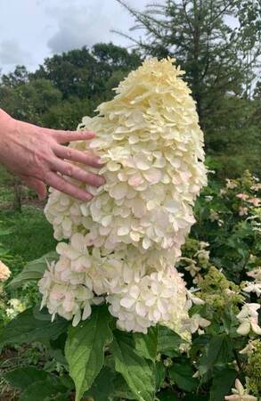 Побеги жесткие, прямостоячие. Листья яйцевидные, темно-зеленые, с обеих сторон жестко опушенные. Цветы только стерильные, очень крупные, собраны в конические соцветия на вершинах побегов. Сорт отличается очень крупными, достигающими 40 см в длину соцветиями. В начале цветения окраска лимонно-зеленая, во время пика цветения соцветия белоснежные и в конце лета розовеют. Высота 150 см.