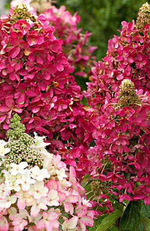 Описание: Куст раскидистый, округлый, в ширину он почти такой же, как в высоту. Ветви прямые, жесткие, коричневые. Соцветия конусовидные, густые, вначале белого цвета, потом розовеют, затем приобретают очень яркий, кроваво-малиновый цвет. Цветки преимущественно стерильные. Окраска изменяется до розовой быстро, насыщенно-красными цветы становятся в августе.Как правило, под цветами не видно листвы. Цветет на концах побегов текущего года. Высокодекоративные кустики не деформируются из-за тяжести соцветий.высота 1.5 м
