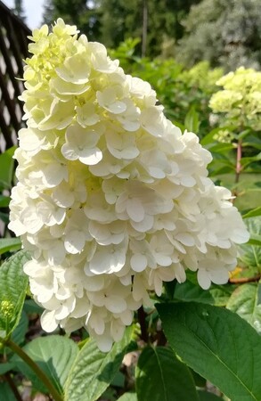 компактный куст высотой до 150 см и такой же ширины. Стерильные цветки диаметром 2,5-3 см, в начале цветения светло-зелёные, затем в основании соцветия приобретают бело-кремовую окраску. Соцветия длиной 20-25 см и диаметром 15-20 см, очень красивые, плотные, конусовидные. Цветение в июле-октябре. Листва однотонная, темно-зеленая, крупная, длина листа 10-15 см, ширина листа 7,5-10 см.