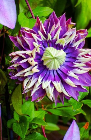 Клематис Тайга махровый (3) - это новый японский сорт, который отличается очень необычными цветками. По мере их распускания меняется не только цвет, но и форма. Бутоны раскрываются в несколько этапов. Сначала раскрываются самые крайние крупные лепестки, окрашенные в сиренево-фиолетовые тона. Затем распускается серединка - мелкие лепестки более яркого пурпурно-фиолетового цвета с желто-зелеными или лимонными кончиками, часть из которых может быть скручена в трубочку. В последнюю очередь становится заметной желтая сердцевинка. Цветки диаметром 12-15 см. Листья темно-зеленые, с ровными краями, эллипсовидные, сердцевидные или тройчатые. Высота растения 2-2,5 м, может выращиваться в контейнерах. Период цветения: с июня по сентябрь. Тип обрезки — 3