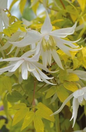 Клематис (княжик) Люминоус Сноу (Luminous Snow).Желтолистный клематис польской селекции. Цветки махровые, диаметром 7 см, колокольчатые, широко открытые, состоят из 4 широких чашелистиков и до 16 длинных, волнистых стаминодий. Лепестки белые. Цветение в мае. С июня до осени куст украшают причудливые пушистые семенные головки. Листья декоративные, золотисто-жёлтые, состоят из 3-5 листочков. Лиана высотой 200-220 см. Группа обрезки: 1-ая (без обрезки)