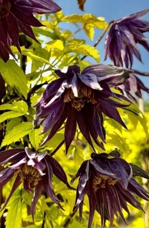 Желтолистный клематис польской селекции. Цветки махровые, диаметром 7-9 см, колокольчатые, широко открытые, с нежным лимонным ароматом, состоят из 4 широких чашелистиков и до 15 длинных, слегка волнистых стаминодий. Лепестки розово-фиолетовые. Цветение в мае. С июня до осени куст украшают причудливые пушистые семенные головки. Листья декоративные, золотисто-жёлтые, состоят из 3-5 листочков. Лиана высотой 200-300 см. За опоры цепляется листовыми черешками. Сорт морозостоек и неприхотлив. Не любит жарких мест. Переносит полутень. Группа обрезки:1-ая (без обрезки)