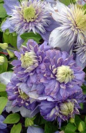 Blue Light' (Блю Лайт), Frans van Haasterd , Голландия, 1998, сеянец от 'Mrs Cholmondeley'.. Группа обрезки - 2.Цветы объёмные, всегда махровые, лилового цвета с лавандовыми оттенками лепестков и плотным кремовым центром. Лиловый цвет клематиса «Блю лайт» мягкий, нежный, и, в то же время, собранный и благородный. В нем скрыта природная мудрость.Цветок клематиса "Блю Лайт" с небесным, цветочным тоном, в котором скрыто спокойствие и очаровательная красота. Диаметр бутона 9-11 см. Один из самых ранних сортов. Крупноцветковый махровый клематис клематис «Блю лайт», цветет обильно и долго в мае-июне на прошлогодней лозе. Повторное цветение в августе-октябре на молодой лозе текущего года. В лиловом цветке клематиса, "Блю Лайт" оттенок пурпура, сильно разведенного белым, с добавлением серого, пурпур придает цветку клематиса мудрость и царственность, белый цвет, олицетворение традиций и материнства, серый же цвет в цветке клематиса – постоянство, тем самым лиловый цвет клематиса "Блю Лайт" несет в себе черты идеального цветка: мягкий, верный, трудолюбивый цветок клематиса сорта «Blue light»
