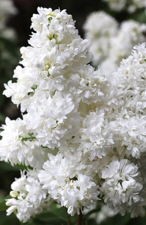 Сирень обыкновенная Сувенир Алисы Хардинг - на самом деле, сирень необыкновенная! Очень эффектный густомахровый сорт! Цветки чисто-белые, крупные, диаметром до 3,0 см, густомахровые, с тонким ароматом. Лепестки с приподнятыми краями и загнутыми кончиками. Метёлки - "мощные", размером 20х8 см. Соцветия крупные, стройные, прочные, из 2-3 пар метёлок. Цветение происходит в средние сроки, очень обильно и продолжительно. Листья сердцевидные, заостренные, глянцевые, темно-зеленые до поздней осени.Сирень хорошо переносит обрезку. Эффективно вырастает на углубленных, быстропроницаемых и оптимально прогретых почвах, а также на освещенных и открытых местоположениях.Сорт морозоустойчивый. Куст вырастает до 3-4 метров.