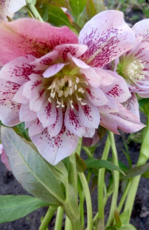 Сортосерия «Double Ellen». Цветки махровые, розовые. На лепестках точечный тёмно-бордовый рисунок. Цветение обильное, в апреле. Листва кожистая глянцевая. Высота 30-40 см. Место полутенистое. Предпочитает некислую, богатую перегноем влажную почву и мульчирование слоем 5-7 см.